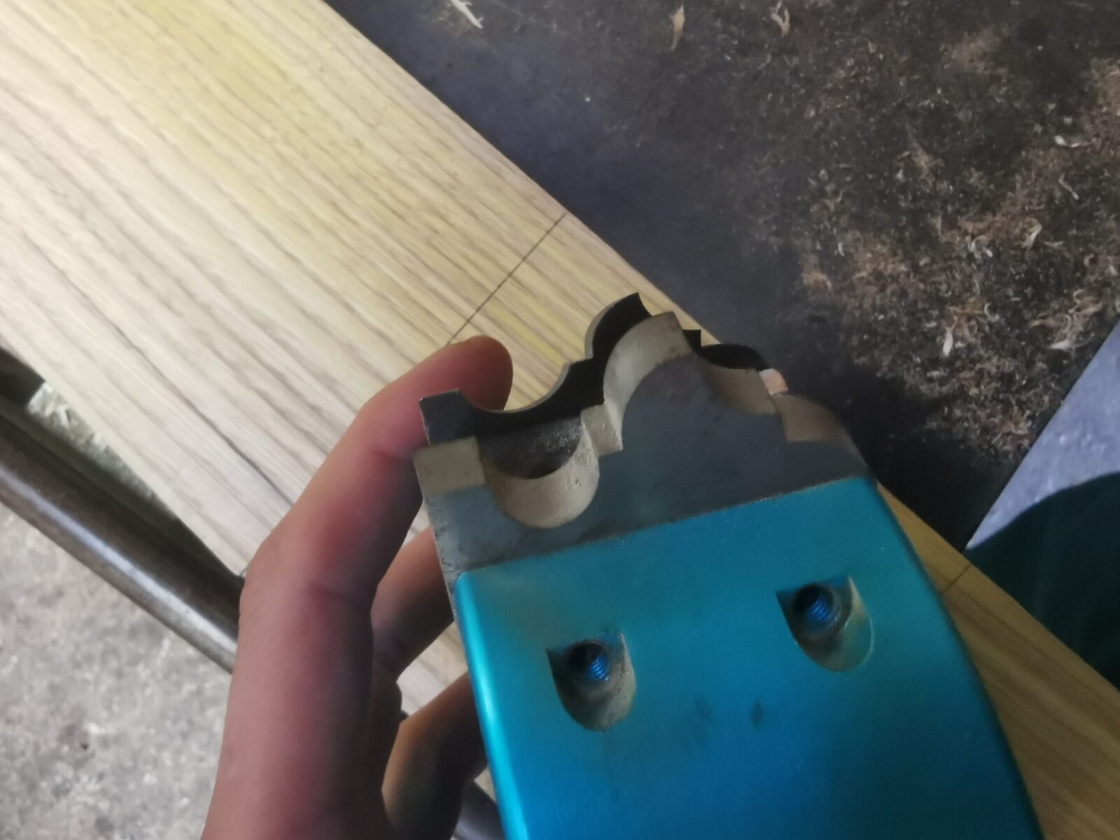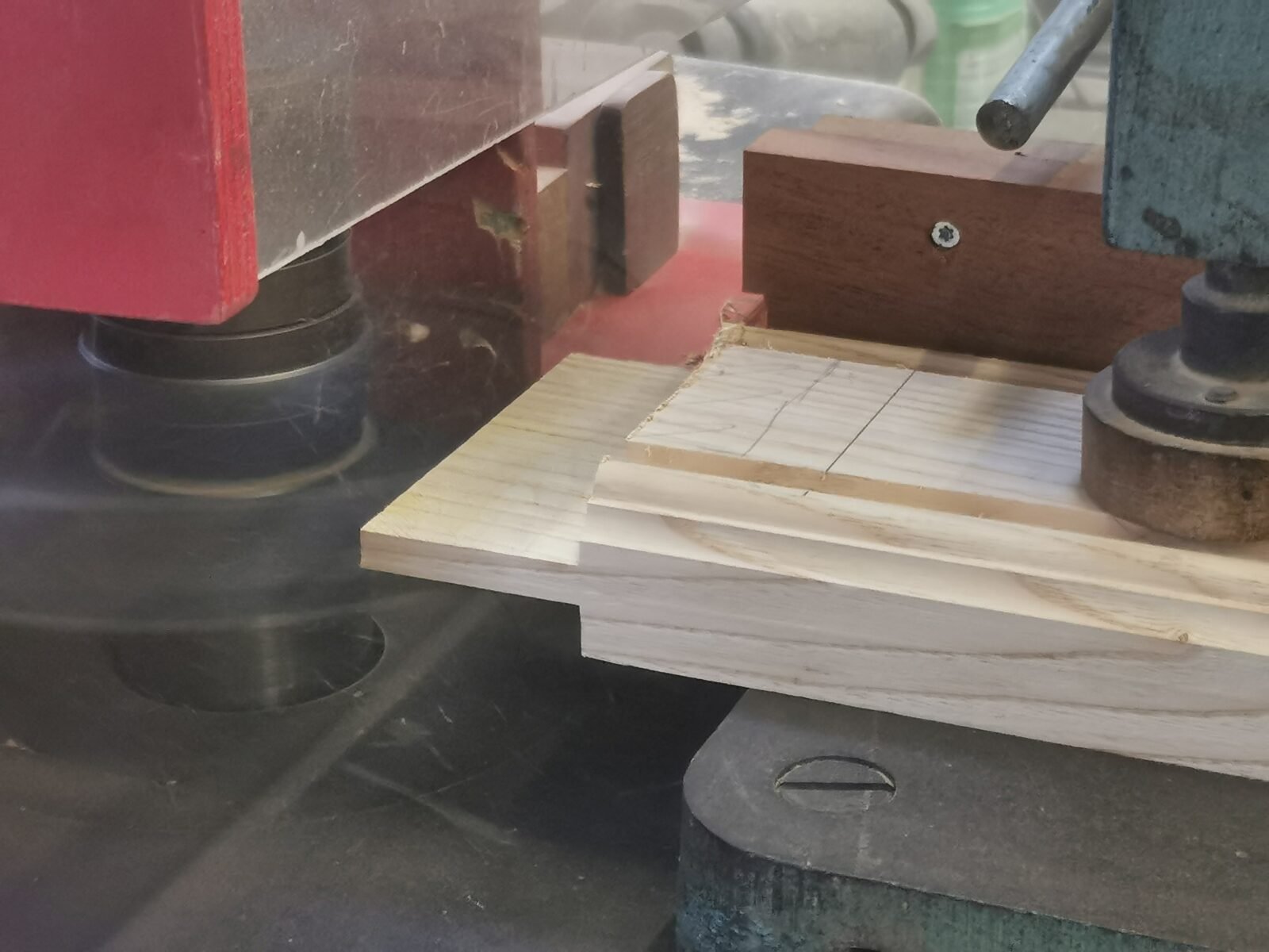 Before cutting the joints, we choose a set of blades together to make the router mouldings. Sufficiently elaborate but not too elaborate for this work reminiscent of old doors. The wood then takes on its first character. The profiles are elegant, sober and regular. The chestnut responds well, is smooth and allows itself to be guided without resistance. The workshop is filled with the warm scent of freshly worked wood.