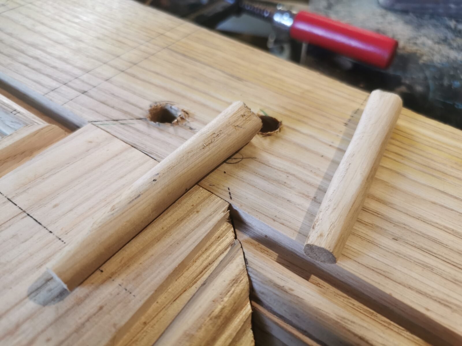 Back in Kerbeleg, I cut my dowels in a ‘V’ shape out of the rough wood. This small detail, almost insignificant to the untrained eye, makes all the difference. Each piece of wood is drilled with a slight offset, using the “soft pull” technique. This means that when the dowels are inserted with force, they naturally pull the two pieces towards each other, ensuring a solid clamp without glue. It’s an old-fashioned technique, but an admirably effective one.