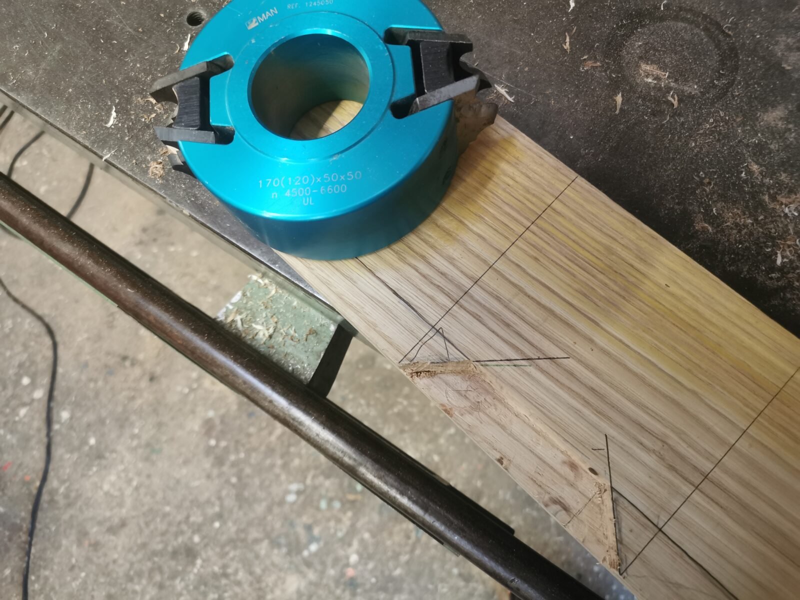 To familiarise myself with all these new machines and tools, we then move on to planing to bring the pieces to their exact dimensions: forty-two millimetres thick, twelve centimetres wide and strictly square. These are tests for the jambs of the future door. With each pass of the plane, we adjust the flatness and I check the squareness. The wood softens, its surface becomes smooth under the hand. These simple gestures lay the foundations for accuracy.