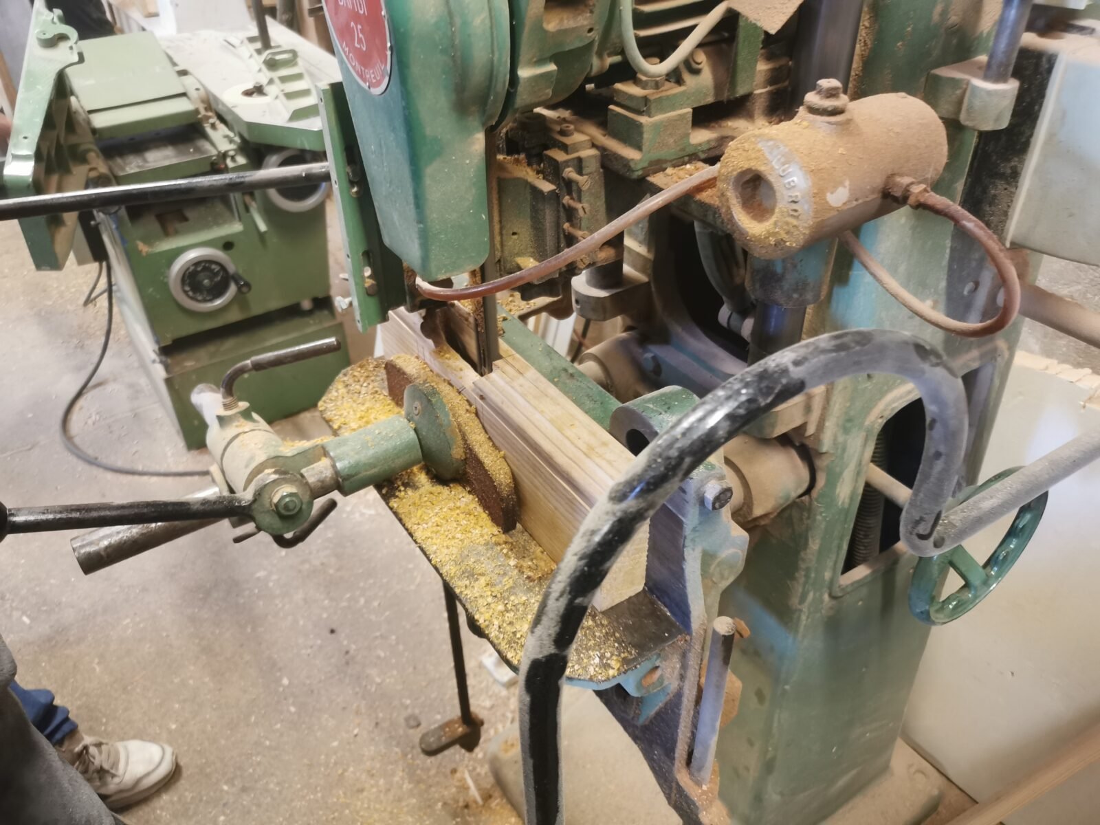 We then move on to the mortising machine. The chestnut offers just the right amount of resistance. Edouard’s movements are slow and measured. Each plunge of the bit digs into the material with both force and gentleness. Once the mortise is clear, we finish trimming the edges with a chisel to ensure a perfect fit.